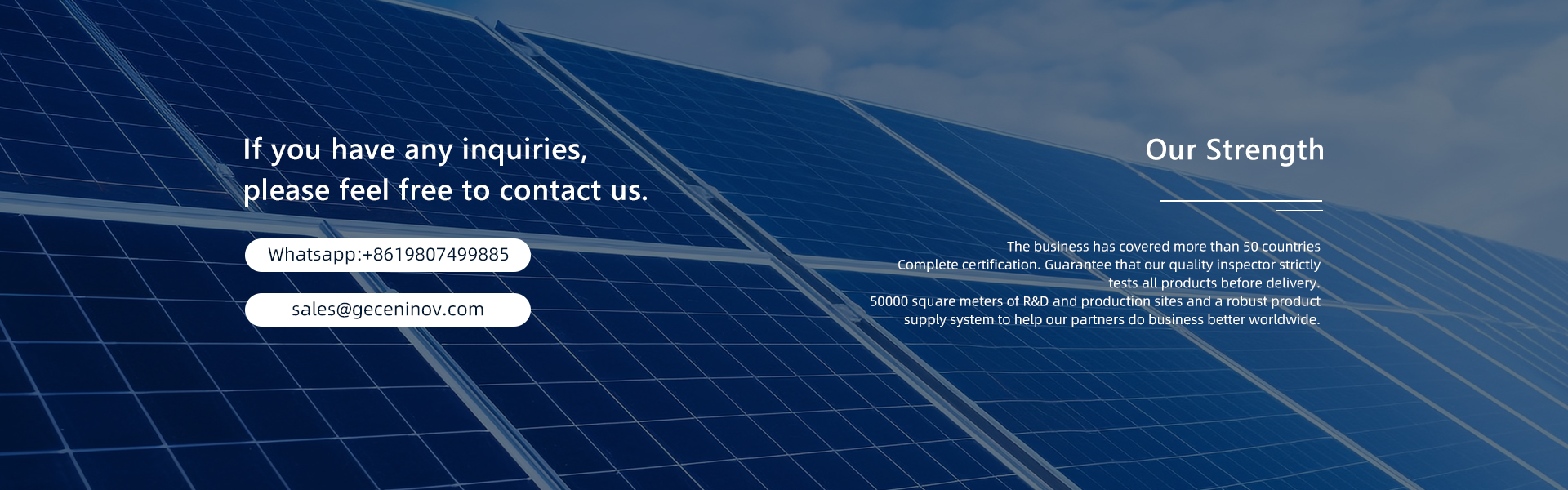 Gecen Electronic Co., Ltd. specializes in developing, producing, and marketing Lifepo4 Battery and Home Energy Storage. Our main products are Lifepo4 Battery, Rv Battery, Yacht Batteries, Forklift Battery, Home Energy, Solar Inverter, and Solar Panels.In these years, we persist with the strategy of excellent quality all the time. On product technology, we respect science and innovation to continuously perfect our skills. Meanwhile, we try our best to provide more and better products and best services for our users.During these years, our products not only have occupied a bigger market at home, but also have succeeded entered into the international market, and have been exported to the Middle East, South Asia, Southeast Asia, North America, and several other nations and regions.